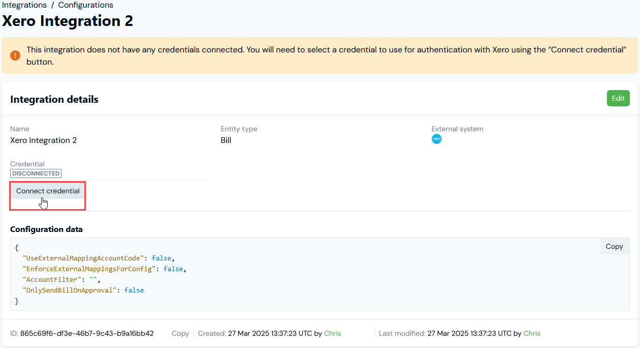 - On the Configurations panel, select the Name hotlink text of the Xero integration you want to set up authentication for. The Integration details page opens: