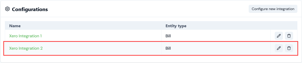 - Select Create integration. You are returned to the Integrations>Xero page, where the integration is listed on the Configurations panel: