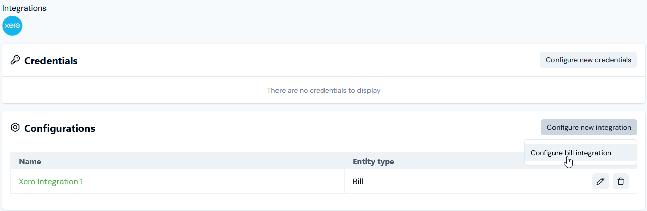 - On the Configurations panel, select Configure new integration>Configure bill integration: