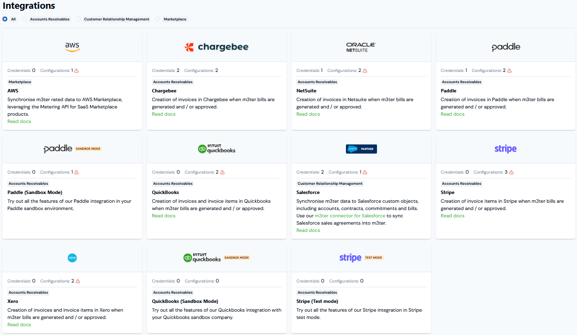 - A Native Integration allows you to send billing data for end-customer Accounts in m3ter into your Accounts Receivables systems. For some external systems, you can also send operational data for entities in your m3ter Organization.