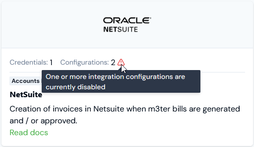 - If either a Credential is disconnected or a Configuration is disabled, then a warning will show and you’ll need to open the Integrations page for the system and investigate: