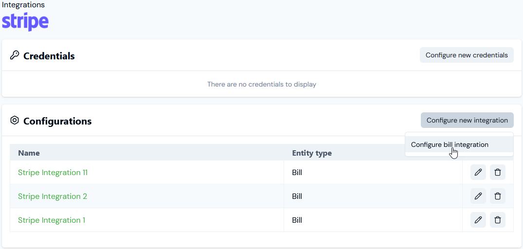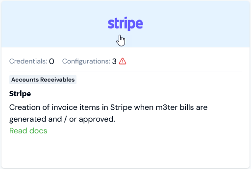 You can create Native Integrations for a billing data flow into external systems. For some external systems, you can also choose to set up Integrations to sync operational entity data in m3ter with the external system. For detailed guidance on creating a Native Integration, please see the relevant specific topic in this section:- Configuring Stripe Integrations