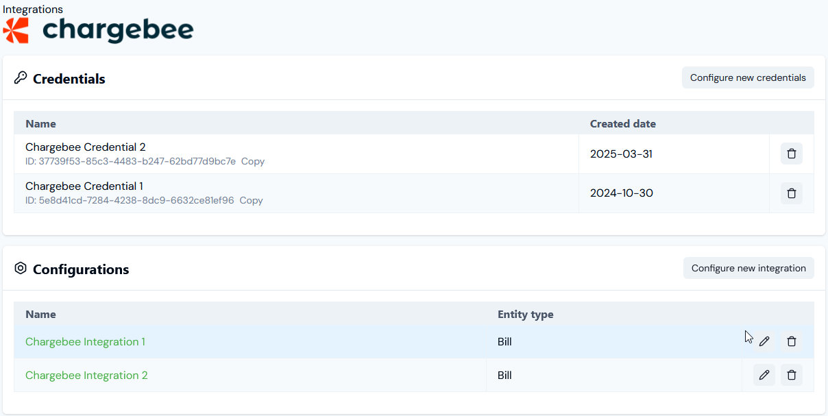 - Note that if you want to create a new Credential, on the Credentials panel select Configure new credentials. See the relevant topic in this section for creating Credentials for specific external systems - for this example Creating Chargebee Integration Credentials.