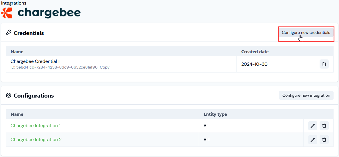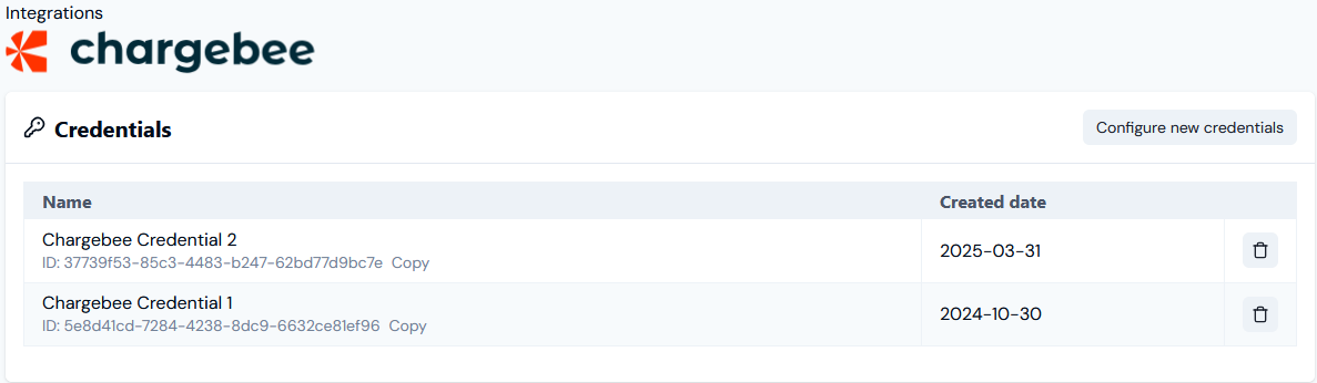 - Select Create credential. You are returned to the Chargebee Integrations page where the new Credential is listed on the Credentials panel: