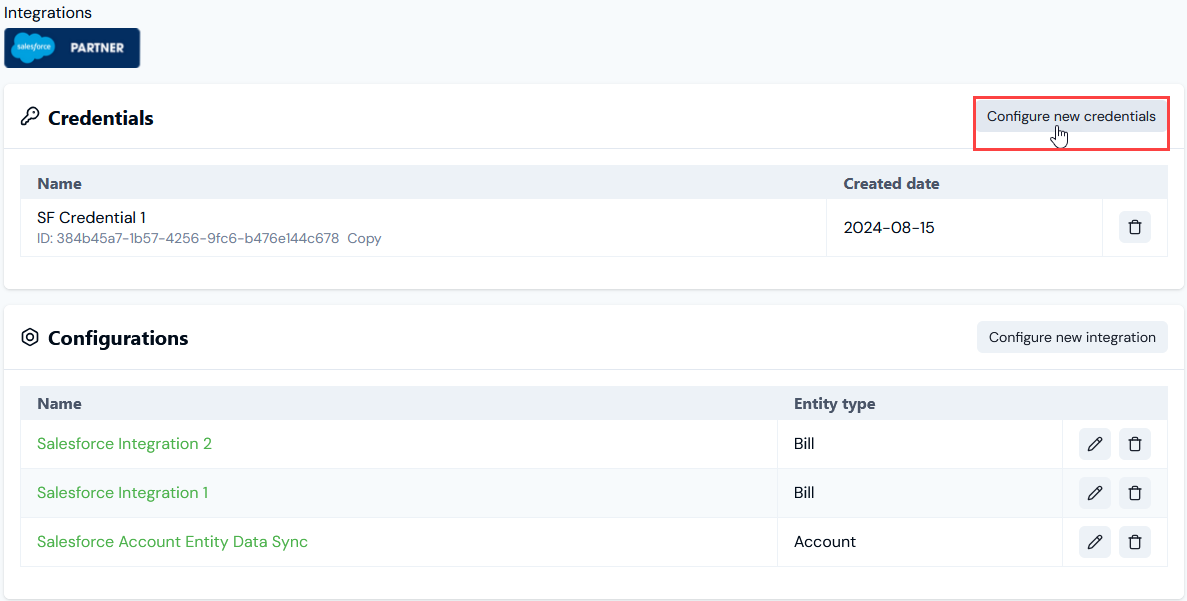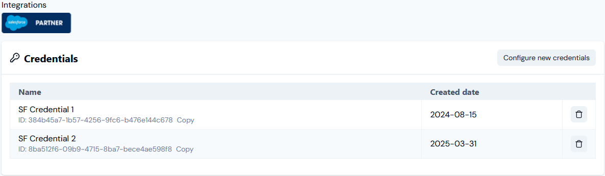 - Select Create credential. You are returned to the Salesforce Integrations page where the new Credential is listed on the Credentials panel: