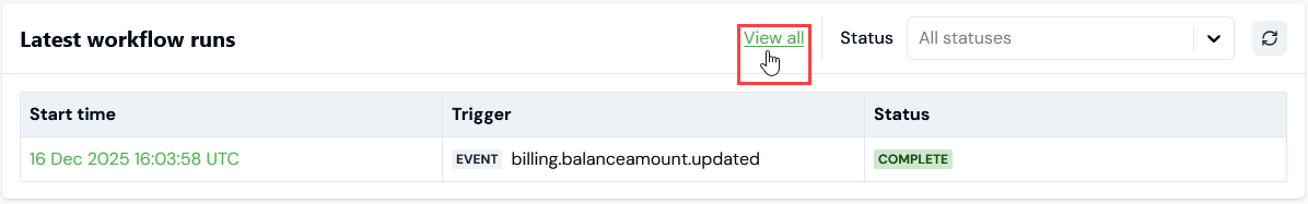 - Scroll down the page to the Latest workflow runs panel. The ten most recent Workflow runs are listed: