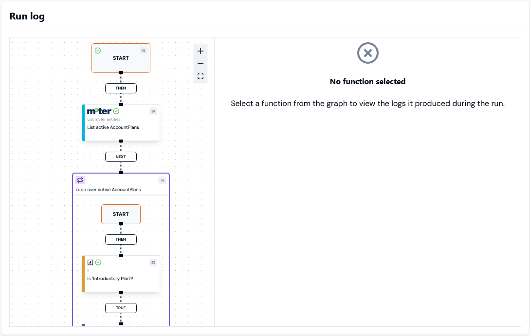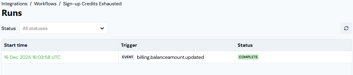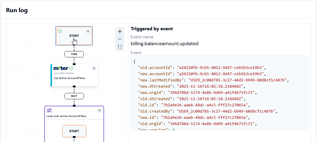 billing.balanceamount.updatedEvent that triggered the Workflow run is loaded. - Similarly, you can review the log details for a functional step performed in the Workflow run: