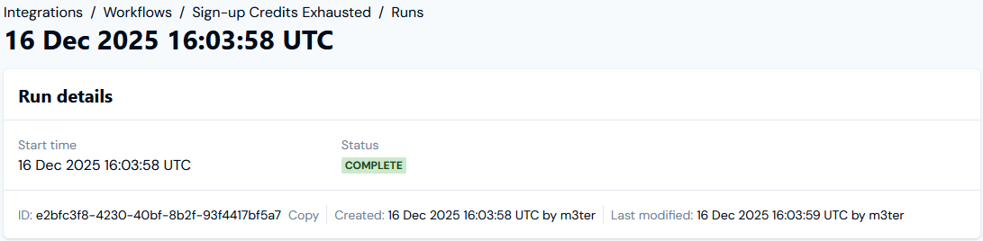 From the Workflow details page, you can quickly open an individual m3sh Workflow run and review detailed run logs on a step-by-step basis. To review individual m3sh Workflow run logs:- Select Integrations. The Integrations page opens.
