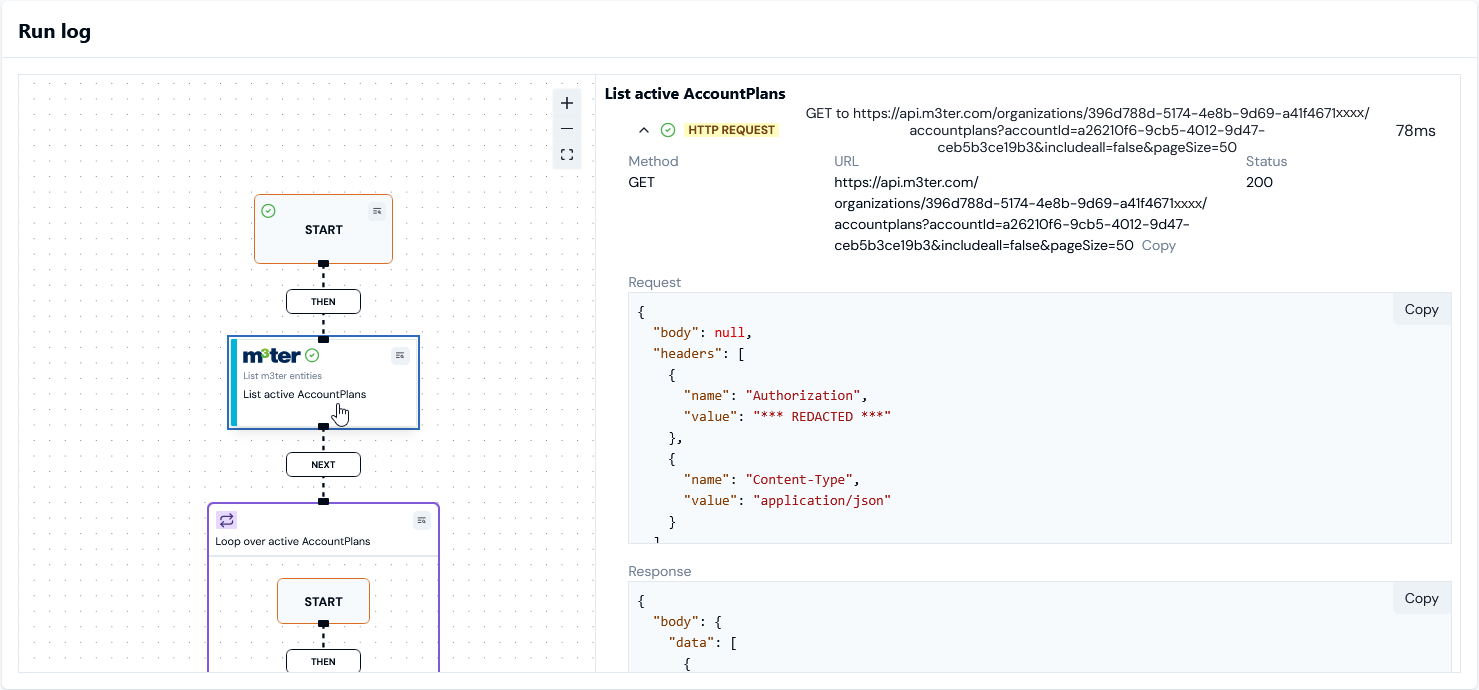 - In this case, the HTTP REQUEST performed by a m3ter API function is shown and you can expand the call to inspect the Request and Response JSON.