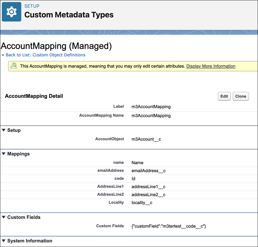 The mapping of custom fields on m3ter entities feature is built on top of the existing custom metadata framework developed for the m3ter Connector. A new attribute added to the Custom Metadata Types (CMDT) framework supports “Custom Fields”. This attribute is a Long Text Area and is used to store a JSON representation of key/value pairs that the user defines. Once this data is on the CMDT, the Sync Orchestration logic can make use of these fields and include them in the payload sent to m3ter.Enabling Mapping for Custom Fields