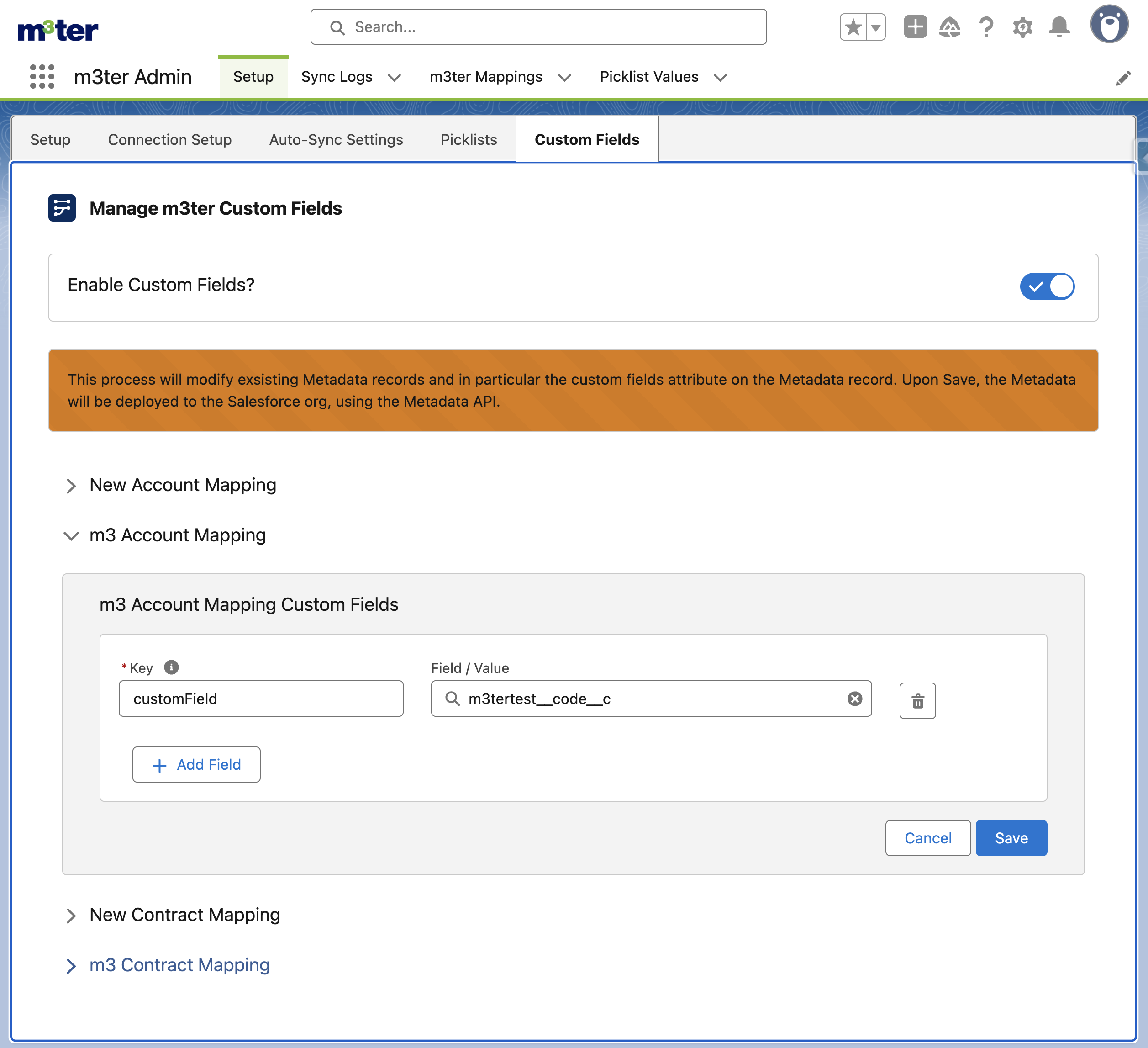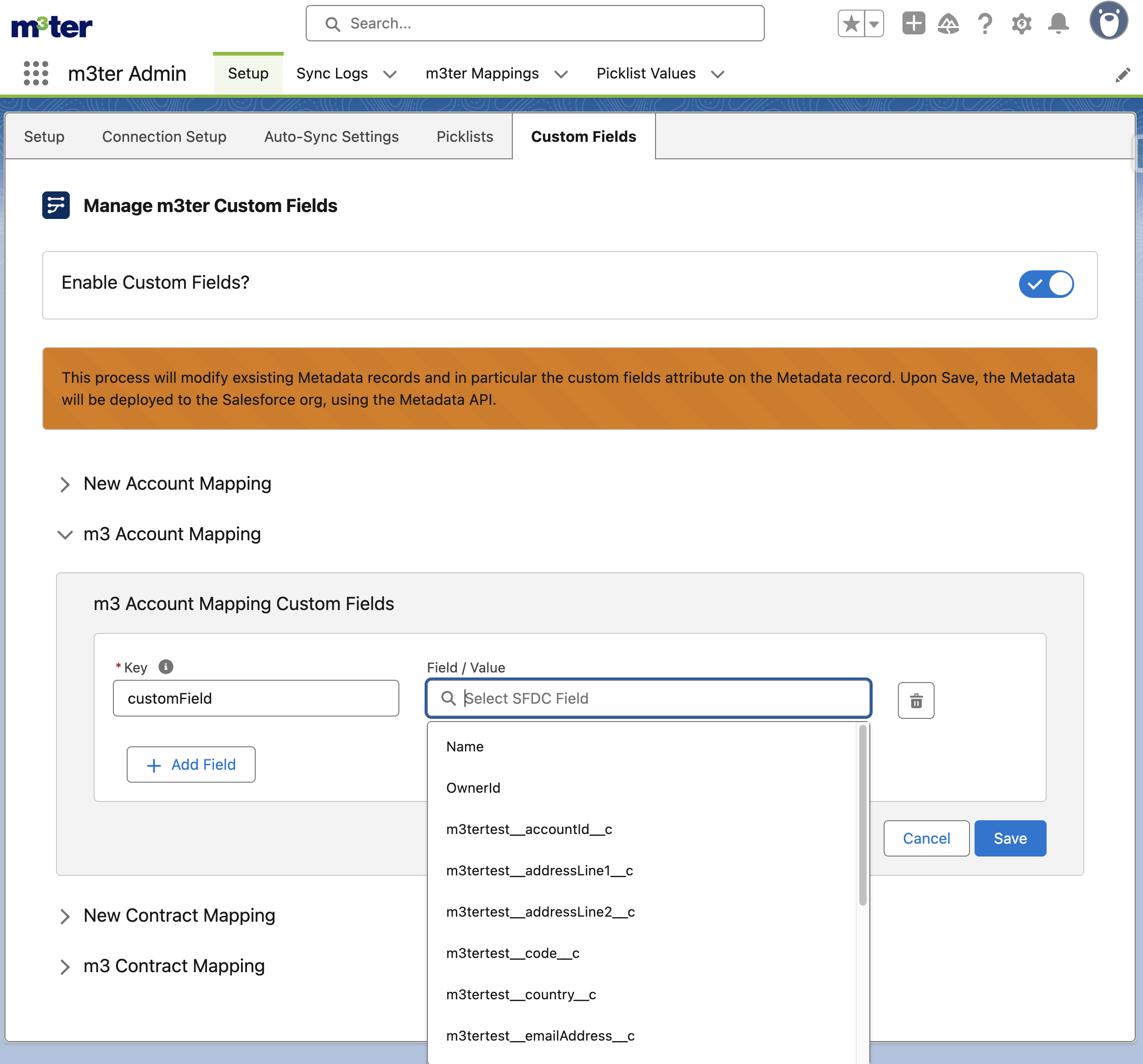 - For v0.8, the mapping custom fields feature is limited to Account and Contract Metadata Types.