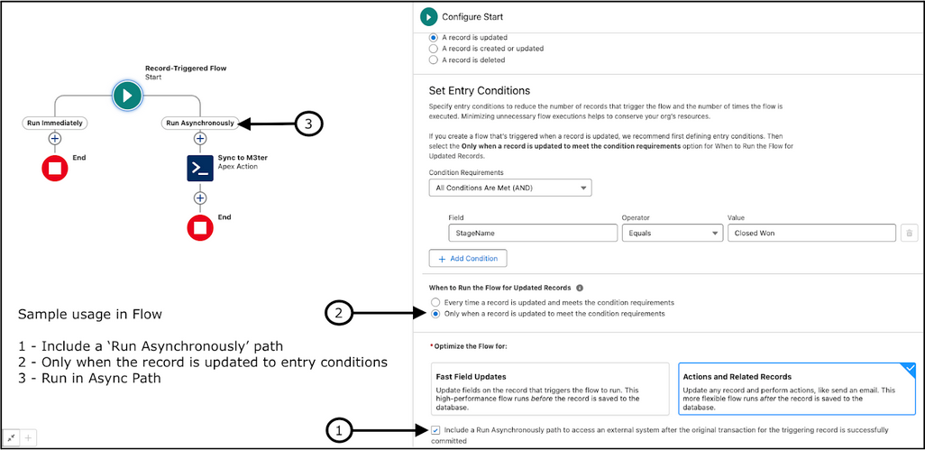 - Include a Run Asynchronously path to access an external system after the original transaction for the triggering record is successfully committed.