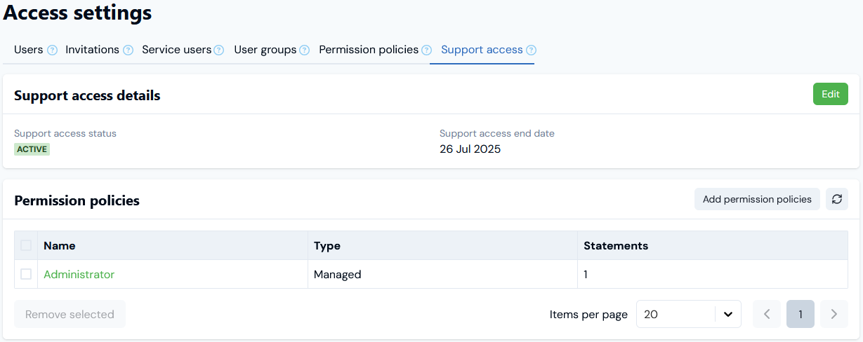 - Select Update support access. You are returned to the Support access tab and the Support access details panel and Permission policies panel now shows the updated Support access:
