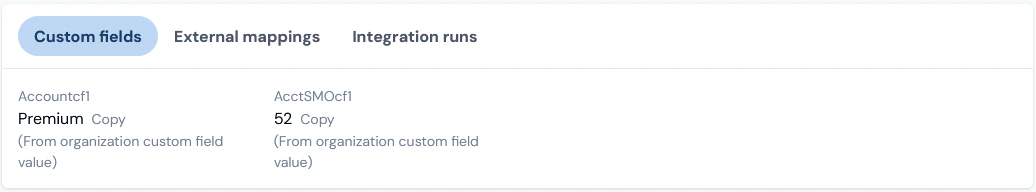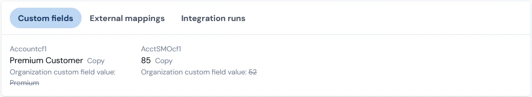 - In this example, Custom Fields have been created at the individual Account level and the values configured for those created at Organizational-level are struck out indicating clearly that the Account level values will be used.