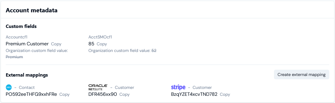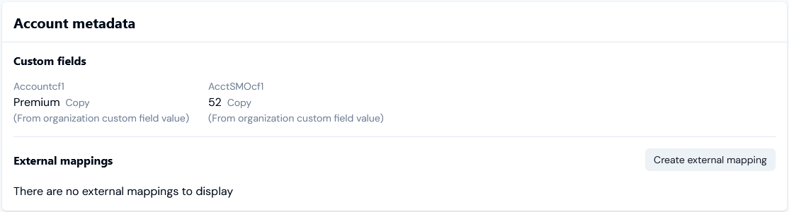 - If you now open the details page for an entity type you’ve created the Custom Fields for, the fields and their values will be shown on the metadata panel. For example, suppose you’ve created two Account Custom Fields at Organizational-level: