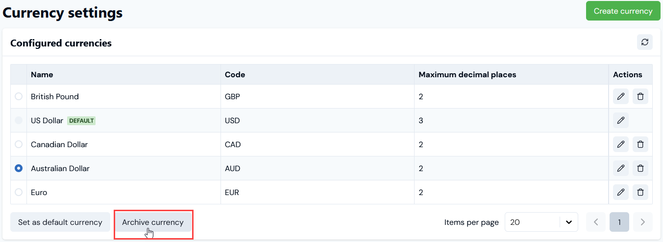 - Alternatively, you can select a currency in the Configured currencies list and select Archive currency: