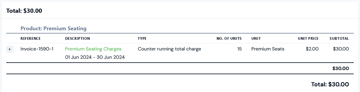 The Recurring Charges feature in m3ter allows you to apply in a flexible way unit-based pricing for products, where end-customers who consume a product are charged on the basis of the number of units - such as seats or licenses - they have subscribed to for each billing period in their contract service period. Importantly, the number of units chargeable can fluctuate from one billing period to the next. This need to keep a precise track of the changing number of chargeable units across separate billing periods is met using Counter Adjustments. For example, suppose you offer a product which you want to charge for based on the number of seats subscribed to within any given billing period, and at a flat rate of $2 per seat. Let’s assume billing is on a monthly frequency and in a typical case you agree a yearly contract service period with end-customers. Here’s an example of a series of Counter Adjustments across several billing periods to illustrate how fluctuations in subscribed seat numbers on an Account are tracked and billed for - note that prorating of any Counter charges is disabled for this example:- If a customer signs up for your product to run from June 1st 2024 until June 30th 2025, and commits to 15 seats for the first month, you can post a Counter Adjustment of 15 using your Seats Counter against their Account on June 1st 2024. The first Bill - dated July 1st 2024 - will charge this initial number of Seats as a Counter running total charge at 15 x $2 = $30: