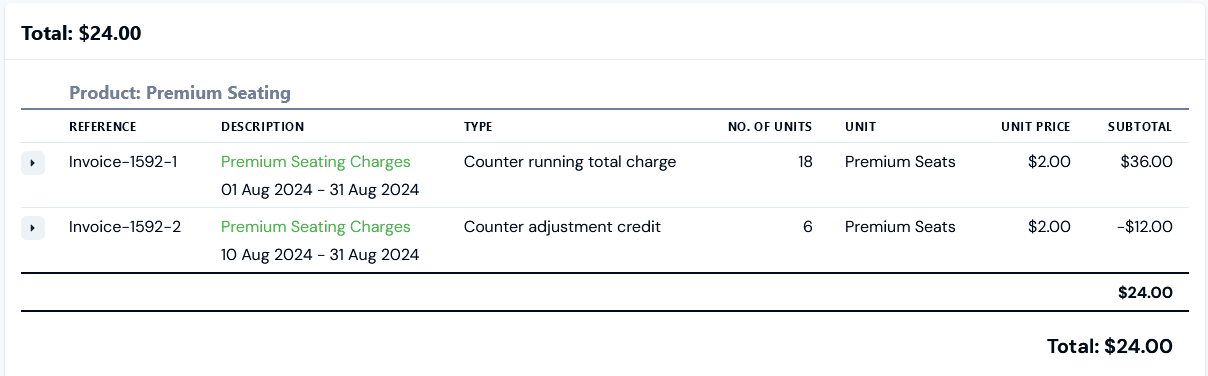 - If a Counter Adjustment is now posted on the Account on August 10th 2024 for a decrease in the number of seats to 12, the third Bill - for the August billing period and dated September 1st 2024 - will charge for the 18 seats as a Counter running total charge at 18 x $2 = $36 and also will apply a credit to the Account as a Counter Adjustment credit at 6 x $2 = -$12, bringing the total billed to $24: