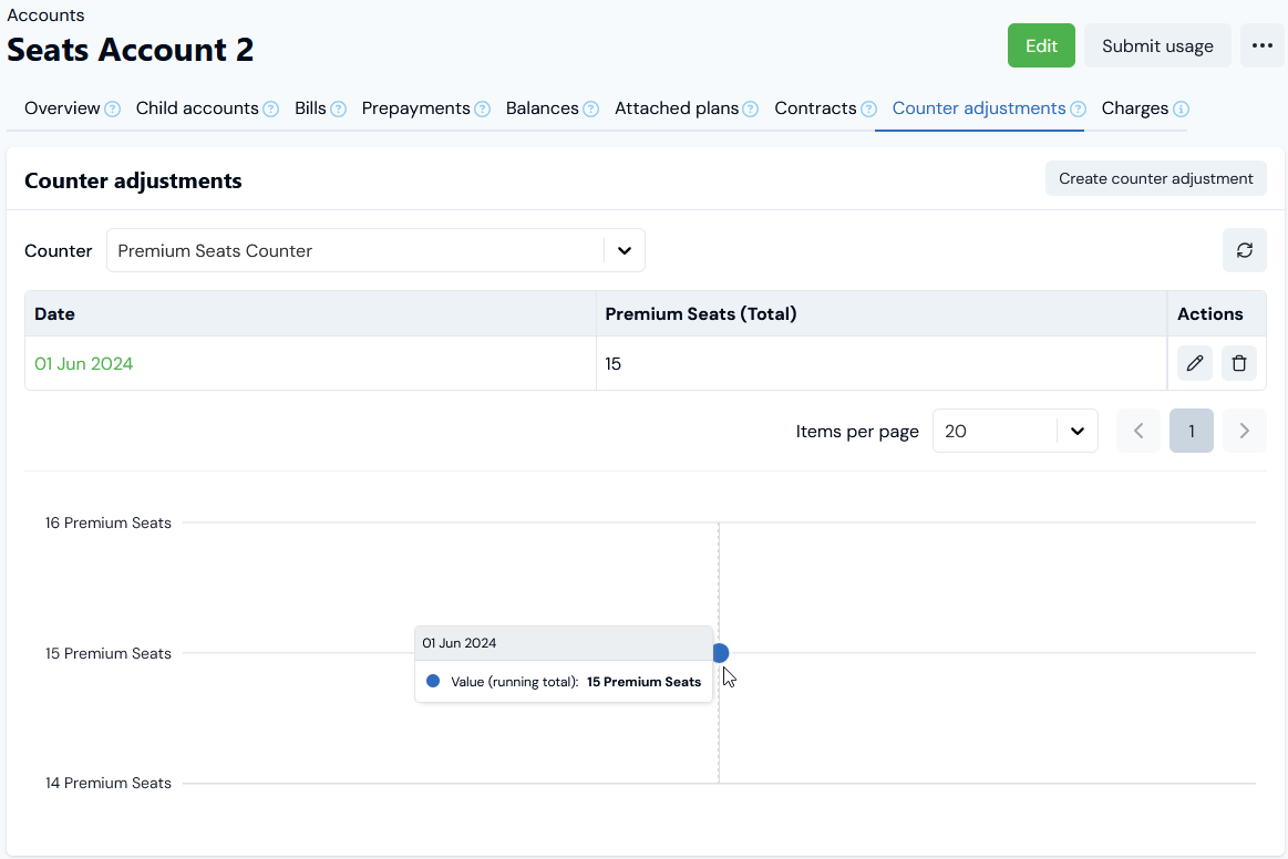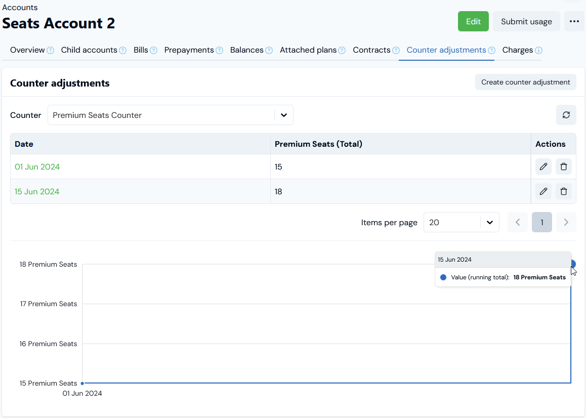 - If however a Counter Adjustment of 18 seats is posted on the Account on July 20th 2024, the second Bill - for July billing period and dated August 1st 2024 - will charge for the 15 seats as a Counter running total charge at 15 x $2 = $30 and also will charge for the extra 3 seats as a Counter Adjustment debit at 3 x $2 = $6, bringing the total billed to $36: