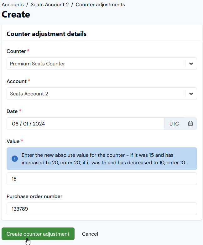 - For the current example, we’ll suppose the end-customer has realized by mid-month they require 18 not 15 seats for June 2024, so we repeat Steps 8 and 9 to create a second Counter Adjustment dated June 15th for the Account: