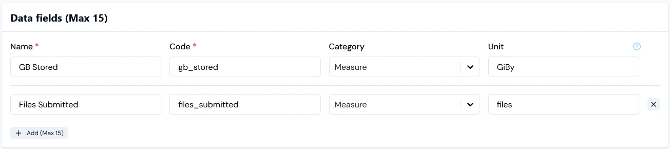- Add the Data fields you need to collect usage data. For example, a field to collect data on the volume of files stored on your service: